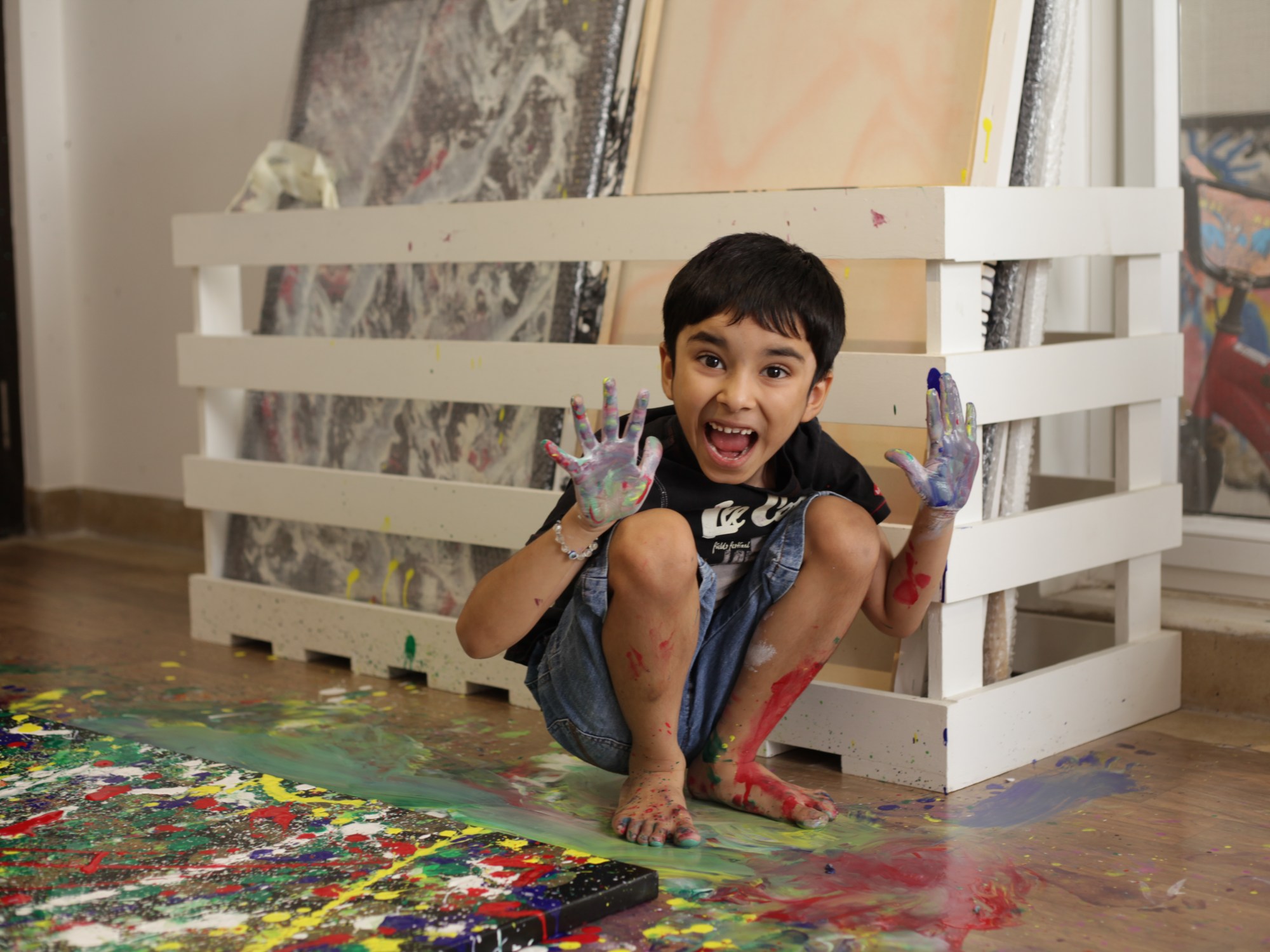 Koosu’s painting works are beautiful abstracts filled with colours, ideas. Koosu’s friend made the photo shoot informal. Koosu was so happy during his working hours on a Painting.
